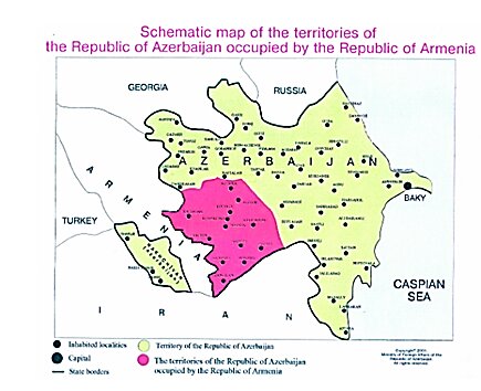 Die Republik Aserbaidschan erklärt, dass sie die Anwendung der Bestimmungen des Übereinkommens und seiner Zusatzprotokolle für die durch die Republik Armenien besetzten Gebiete bis zu deren Befreiung von der Besetzung nicht gewährleisten kann (eine schematische Karte der besetzten Gebiete der Republik Aserbaidschan ist angeschlossen).