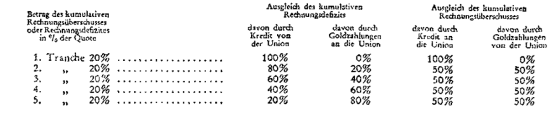 a) Der Rechnungsüberschuß oder das Rechnungsdefizit einer Vertragspartei wird durch Kredite und Goldzahlungen gemäß lit. b dieses Artikels ausgeglichen, jedoch nur insoweit, als der kumulative Rechnungsüberschuß oder das kumulative Rechnungsdefizit dieser Vertragspartei die in der nachstehenden Tabelle III für die festgesetzte Quote nicht überschreitet.