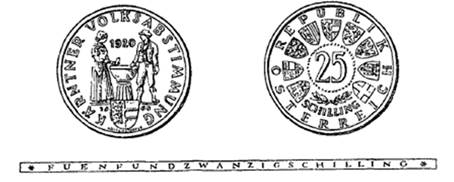 Die Münzen sind aus einer Legierung von 800 Tausendteilen Silber und 200 Tausendteilen Kupfer hergestellt; sie haben einen Durchmesser von 30 mm und ein Rauhgewicht von 13 g, enthalten somit 10'4 g Feinsilber. Abweichungen hievon dürfen im Feingehalt 5/1000 und im Gewicht 10/1000 nicht übersteigen. Die eine Seite zeigt ein zur Rechten und Linken einer Abstimmungsurne stehendes Paar in Rosentaler Volkstracht; unter der Urne befindet sich das Kärntner Wappen und das Ausgabejahr „1960“. Die kreisförmige Umschrift lautet „Kärntner Volksabstimmung“, die Jahreszahl „1920“ ist im Raume über der Urne angebracht. Die andere Seite zeigt in der Mitte die Ziffer „25“, darunter einen Lorbeerzweig und das Wort „Schilling“, umgeben von der Umschrift „Republik Österreich“. Die innere Einfassung besteht auf beiden Seiten aus einem flachen Stäbchen. Der Rand der Münze ist glatt und trägt die vertiefte Inschrift „Fuenfundzwanzig Schilling“.