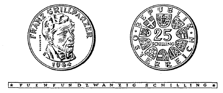 Die Münzen sind aus einer Legierung von 800 Tausendteilen Silber und 200 Tausendteilen Kupfer hergestellt; sie haben einen Durchmesser von 30 mm und ein Rauhgewicht von 13 g, enthalten somit 10'4 g Feinsilber. Abweichungen hievon dürfen im Feingehalt 5/1000 und im Gewicht 10/1000 nicht übersteigen. Die eine Seite zeigt das Kopfbild des Dichters Franz Grillparzer im Dreiviertel-Profil, umgeben von der halbkreisförmigen Umschrift „Franz Grillparzer“, sowie das Ausgabejahr „1964“. Die andere Seite zeigt in der Mitte die Zahl „25“, darunter das Wort „Schilling“, ferner in kreisförmiger Reihung das Bundeswappen und die Wappen der neun Bundesländer sowie die Umschrift „Republik Österreich“. Beide Seiten der Münze sind von einer erhöhten Randleiste umrahmt. Der Rand der Münze ist glatt und trägt die vertiefte Inschrift „Fuenfundzwanzig Schilling“.