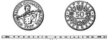 Die eine Seite der Münze hat ein Brustbild des Geige spielenden Komponisten Johann Strauß, umgeben von der kreisförmigen Umschrift „100 Jahre Donauwalzer“, sowie die Jahreszahl „1967“ zu zeigen. Die andere Seite hat in der Mitte die Zahl „50“, darunter das Wort „Schilling“, ferner in kreisförmiger Reihung das Bundeswappen und die Wappen der neun Bundesländer sowie die Umschrift „Republik Österreich“ zu zeigen. Beide Seiten sind mit einer erhöhten Randleiste zu umrahmen. Der Rand der Münze ist glatt zu gestalten und hat die vertiefte Inschrift „Fuenfzig Schilling“ zu tragen.