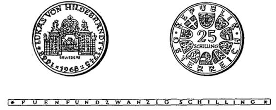Die eine Seite der Münze hat das Hauptportal zum Oberen Belvedere-Garten, umgeben von der kreisförmigen Umschrift „1668 Lukas von Hildebrandt 1745“ und die Jahreszahl „1968“ zu zeigen. In der Portalöffnung ist der Mittelteil des Schlosses zu sehen; darunter befindet sich die Inschrift „Belvedere“. Die andere Seite der Münze hat in der Mitte die Zahl „25“, darunter das Wort „Schilling“, ferner in kreisförmiger Reihung das Bundeswappen und die Wappen der neun Bundesländer sowie die Umschrift „Republik Österreich“ zu zeigen. Beide Seiten sind mit einer erhöhten Randleiste zu umrahmen. Der Rand der Münze ist glatt zu gestalten und hat die vertiefte Inschrift „Fuenfundzwanzig Schilling“ zu tragen.