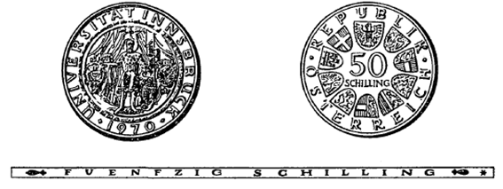 Die eine Seite der Münze hat das Siegel der Universität Innsbruck, umgeben von der Umschrift „Innsbruck“ und der Jahreszahl „1970“ zu zeigen.