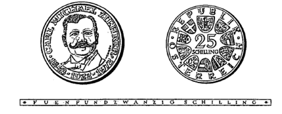 (1) Die eine Seite der Münze hat das Kopfbild von Carl Michael Ziehrer, umgeben von der Umschrift „Carl Michael Ziehrer“ und den Jahreszahlen „1843-1922-1972“ zu zeigen.