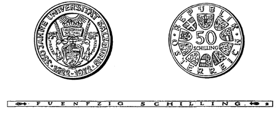 (1) Die eine Seite der Münze hat das Siegel der Universität Salzburg, umgeben von der Umschrift „350 Jahre Universität Salzburg“ und den Jahreszahlen „1622-1972“ zu zeigen.