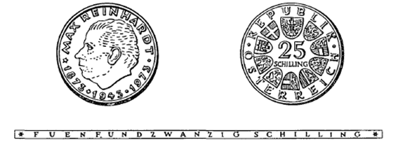 (1) Die eine Seite der Münze hat das Kopfbild von Max Reinhardt, umgeben von der Umschrift „Max Reinhardt“ und die Jahreszahlen „1873-1943-1973“ zu zeigen.