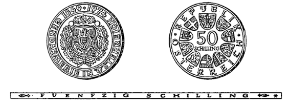 (2) Die andere Seite hat in der Mitte die Zahl „50“, darunter das Wort „Schilling“, ferner in kreisförmiger Reihung das Bundeswappen und die Wappen der neun Bundesländer sowie die Umschrift „Republik Österreich“ zu zeigen. Beide Seiten sind mit einer erhöhten Randleiste zu umrahmen. Der Rand der Münze ist glatt zu gestalten und hat die vertiefte Inschrift „Fuenfzig Schilling“ zu tragen.