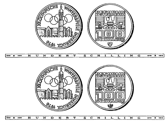 (1) Die eine Seite hat die Randschrift „XII. Olympische Winterspiele Innsbruck 1976“, die fünf Olympischen Ringe sowie eine Stadtansicht von Innsbruck zu tragen.