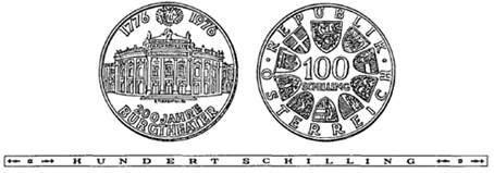 (1) Die eine Seite hat die Ansicht des Burgtheaters, umrahmt von den Jahreszahlen 1776, 1976 und der Inschrift 200 Jahre Burgtheater, sowie dem damaligen Staatswappen zu tragen.