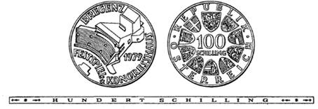 (2) Die andere Seite hat in der Mitte die Zahl „100“, darunter das Wort „Schilling“, ferner in kreisförmiger Reihung das Bundeswappen und die Wappen der neun Bundesländer sowie die Umschrift „Republik Österreich“ zu tragen.