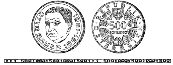 (1) Die eine Seite hat das Kopfbild von Otto Bauer, die Inschrift „Otto Bauer“ und die Jahreszahlen „1881-1981“ zu zeigen.