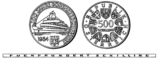 (1) Die eine Seite hat das Passagierschiff Vorarlberg, darunter das Wappen des Bundeslandes Vorarlberg und die Jahreszahl „1984“, sowie die Umschrift „100 JAHRE BODENSEESCHIFFAHRT“ zu zeigen.