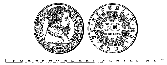 (2) Die andere Seite hat in der Mitte die Zahl „500“, darunter das Wort „SCHILLING“, ferner in kreisförmiger Reihung das Bundeswappen und die Wappen der neun Bundesländer sowie die Umschrift „REPUBLIK ÖSTERREICH“ zu tragen.