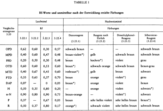 Man vergleicht die Rf und die an jeder Probe erhaltenen Färbungen mit denen der Vergleichssubstanzen. In Tabelle I sind die Rf und Färbungen angegeben, wie sie mit den einzelnen Lauf- und Nachweismitteln für jede Probe erzielt wurden.