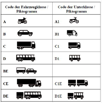 2. 11. Die Fahrzeugklassen (Unterklassen), für die der Führerschein gilt, werden durch die Piktogramme in der unten stehenden Tabelle dargestellt.