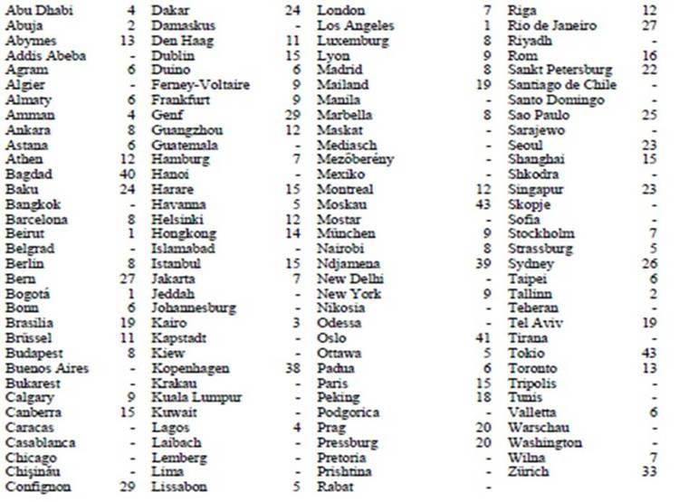 Für nachstehend angeführte Dienstorte im Ausland wird der Hundertsatz für die Bemessung von Kaufkraftausgleichszulagen nach § 21b Abs. 1 GehG für den Monat Mai 2010 wie folgt festgesetzt: