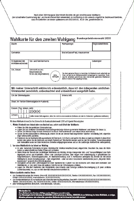 (2) Hierzu hat der Wähler den von ihm ausgefüllten amtlichen Stimmzettel in das beige-farbene Wahlkuvert zu legen, dieses zu verschließen und in die Wahlkarte zu legen. Sodann hat er auf der Wahlkarte durch Unterschrift eidesstattlich zu erklären, dass er den amtlichen Stimmzettel persönlich, unbeobachtet und unbeeinflusst ausgefüllt hat, anschließend die Wahlkarte zu verschließen und so rechtzeitig im Postweg, bei einer Stimmabgabe im Ausland allenfalls im Weg einer österreichischen Vertretungsbehörde oder einer österreichischen Einheit, an die zuständige Bezirkswahlbehörde zu übermitteln, dass die Wahlkarte dort spätestens am achten Tag nach dem Wahltag bis 14.00 Uhr einlangt. Aus der Wahlkarte mit der eidesstattlichen Erklärung haben die Identität des Wählers sowie der Ort und der Zeitpunkt (Datum und Uhrzeit) des Zurücklegens des verschlossenen beige-farbenen Wahlkuverts in die Wahlkarte hervorzugehen. Die eidesstattliche Erklärung muss vor Schließen des letzten Wahllokals in Österreich abgegeben worden sein.