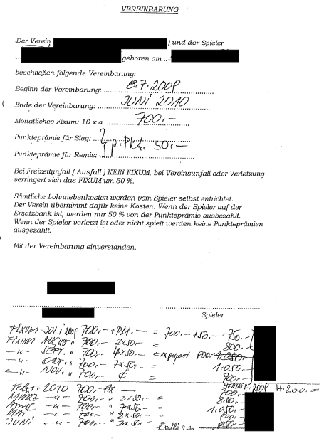 Mit den Spielern wurde ein monatliches Fixum und teilweise zusätzlich eine Punkteprämie (für Sieg oder für Remis) vereinbart. Weiters wurde vereinbart, dass bei Freizeitunfall (Ausfall) kein Fixum zusteht und sich das Fixum bei Vereinsunfall oder Verletzung um 50% verringert. Die Entrichtung sämtlicher Lohnnebenkosten wurde dem Spieler aufgetragen.