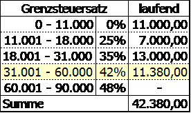 Unter Außerachtlassung der Abfindungszahlung befand sich der Bf. 2016 bei einem (Rest)Einkommen von EUR 42.380,00 im Grenzsteuersatzbereich von 42%. In diesem Bereich bleibt er auch bei Anwendung der Drittelverteilung.