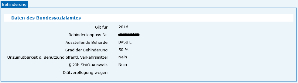 In der elektronisch eingebrachten Arbeitnehmerveranlagung für das Jahr 2016 wurden Aufwendungen für außergewöhnliche Belastungen auf Grund einer eigenen Behinderung sowie einer Behinderung des (Ehe)Partners geltend gemacht.