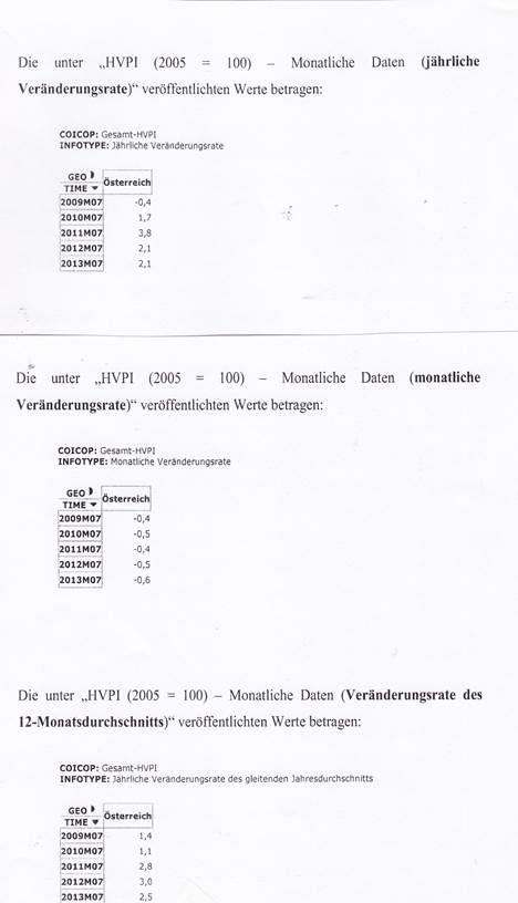 Den Mauttarifverordnungen 2009, 2010, 2011 und 2012 liegt jeweils der letztgenannte Wert (Veränderungsrate des 12‑Monatsdurchschnitts) zugrunde. Dieser Wert wurde vom zuständigen Beamten jeweils Anfang Oktober nach Feststehen der endgültigen Werte für Juli ermittelt. Um zu einer Verkürzung des Begutachtungsverfahrens beizutragen, wurde die Begutachtungsfrist regelmäßig auf zwei (statt der üblichen sechs Wochen) verkürzt. Infolge der dennoch erst im November oder Dezember geschehenen Veröffentlichung der jeweiligen Mautsätze war es für die klagende Partei schwierig bzw unmöglich, die Mautsätze bei ihrer Kalkulation und ihren Vertragsverhandlungen zu berücksichtigen. Die Kunden der klagenden Partei akzeptieren nämlich keine Tagespreise. Wie in der Transportbranche allgemein üblich ‑ werden Verträge für ein, zwei oder auch drei Jahre abgeschlossen. Es ist nicht möglich, dass mit den Kunden nach Anpassung der Mauttarife Vertragsnachverhandlungen geführt werden. Im Jahr 2013 versuchte der Geschäftsführer der klagenden Partei deshalb selbst, aufgrund des Gesetzestextes des BStMG den Mautpreis bzw den „richtigen Index“ zu ermitteln. Er gelangt auf der Seite von EUROSTAT zu diversen Tabellen und letztlich zu den unter „HVPI 2005 = 100 ‑ monatliche Daten (jährliche Veränderungsrate)“ angeführten Werten.