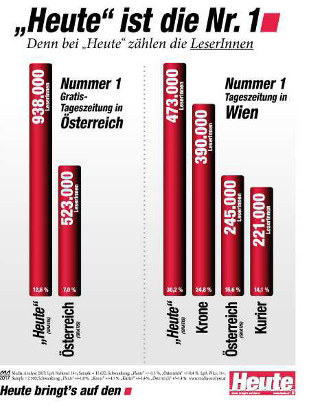 2.2 In der beanstandeten Werbeeinschaltung wird gleich unterhalb der Überschrift in Form von Diagrammen auf die Leserzahlen (Reichweite) der verglichenen Tageszeitungen Bezug genommen und klargestellt, dass sich daraus ergeben soll, dass die Zeitung der Beklagten bei den Gratiszeitungen in Österreich (österreichweit) und bei den Tageszeitungen in Wien die Nummer 1 ist, also in Bezug auf die beiden Reichweitenkategorien über die meisten Leser verfügt.
