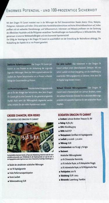 Die den Klägern von der Beraterin übergebene Werbebroschüre (vier Seiten im Format A4) beschreibt unter der Überschrift „Asiens Währungen vor dem Durchbruch“ die Kursentwicklung der für das beworbene Zertifikat maßgeblichen asiatischen Währungen und verweist auf die wachsende Bedeutung Süd- und Ostasiens für die Weltwirtschaft, die hohen Exportüberschüsse, die boomende Binnenkonjunktur, die großen Währungsreserven (insbesondere Chinas) sowie den politischen Aufwertungsdruck. Die Wachstumsraten der betreffenden Länder sind ‑ im Vergleich zum Euro-Raum ‑ grafisch dargestellt und Gründe aufgezählt, warum mit einer Aufwertung der im Währungskorb vertretenen Währungen zu rechnen sei. Unter der Überschrift „enormes Potential und 100%ige Sicherheit“ wird erläutert, dass der Anleger während der Laufzeit des Papiers im Ausmaß von 200 % an der Aufwertung des Währungskorbs teilnimmt, dass die Rückzahlung des gesamten eingesetzten Kapitals garantiert wird („100 Prozent Kapitalgarantie“), dass die Laufzeit vier Jahre beträgt und das Produkt „in Partnerschaft mit Lehman Brothers, einem der weltweit führenden Anbieter für strukturierte Währungsprodukte mit spezieller Expertise für den asiatischen Raum begeben“ wird. Die Kapitalgarantie wird dahin näher erläutert, dass es trotz des hohen Ertragspotentials für den Anleger kein Verlustrisiko gebe, weil eine Garantie für das gesamte eingesetzte Kapital vorhanden sei. Auch wenn der Währungskorb abgewertet werden sollte, erhalte der Anleger den vollen Kapitaleinsatz zurück. Unter der Zwischenüberschrift „Große Chancen, kein Risiko“ werden die Vorteile des Produkts unter Hinweis auf 13,38 % pa historische Rendite auf Basis einer Rückrechnung für alle vier Jahresperioden von 1992 bis 2006 mit den Schlagworten: „Basket der attraktivsten asiatischen Währungen, 100% Kapitalgarantie, hohe Performancepartizipation, kurze Laufzeit und Referenzwährung EUR“ zusammengefasst. Daneben wird unter der Überschrift „Eckdaten“ die Emittentin Lehman Brothers Treasury Co. BV genannt und auf deren Rating A1/A+/A+ (dies entspricht offenbar den Bewertungen der führenden Rating-Agenturen Moody's, S&P und Fitch, vgl Baum aaO FN 1) verwiesen. Die Wertpapierart wird mit „Zertifikat mit Kapitalgarantie“ beschrieben, die vierjährige Laufzeit beginnend ab 5. 12. 2006 datumsmäßig angeführt sowie Emissionskurs (100 % zuzüglich 5 % Agio), Basiswert (näher beschriebener asiatischer Währungskorb), Partizipation (200 %), Stückelung (1.000 EUR) und die Orte der Börsennotiz (Luxemburg und Frankfurt) ausgewiesen. Die Werbebroschüre enthält keinen Hinweis auf die Person der Garantin (eine andere Gesellschaft der Lehmann-Gruppe).