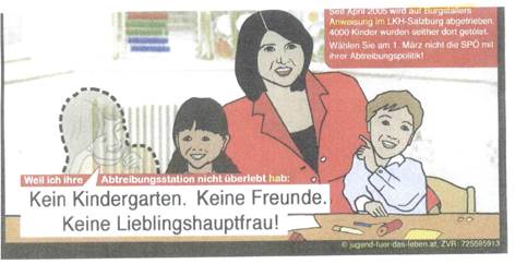 „Seit April 2005 wird auf Burgstallers Anweisung im LKH-Salzburg abgetrieben. 4000 Kinder wurden seither dort getötet. Wählen sie am 1. März nicht die SPÖ mit ihrer Abtreibungspolitik!“.