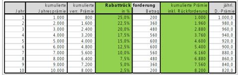 Diese Art der Dauerrabattrückforderung führt bei vorzeitiger Vertragsauflösung je nach Vertragslaufzeit zu unterschiedlich hohen Rückforderungsbeträgen, wobei die absoluten Beträge zunächst jährlich ansteigen und sodann fallen. Bei einer Jahresprämie von beispielsweise 1.000 EUR ergibt die Anwendung dieser Dauerrabattregelung folgende Rückforderungsbeträge: