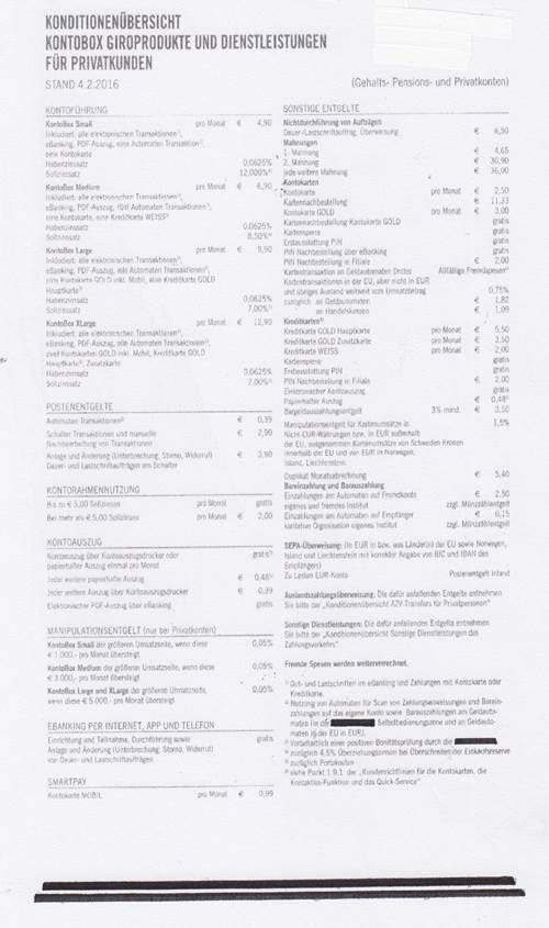 Bitte beachten Sie: Liegt bis zum 31. 12. 2016 kein von Ihnen unterfertigter KontoBox-Antrag bei uns vor, kündigen wir bereits jetzt unter Bezugnahme auf Ziffer 23 unserer Allgemeinen Geschäftsbedingungen unter Einhaltung einer zweimonatigen Frist Ihren Kontovertrag (….). In diesem Fall wird Ihr Kontovertrag per 31. 01. 2017 beendet . Ab 01. 02. 2017 können Sie das Konto und die damit verbundenen Dienstleistungen sowie bestehende Kredit- und/oder Kontokarten nicht mehr nutzen. …“