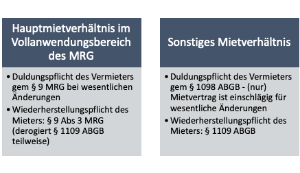 Der Vermieter hat gewisse bauliche Veränderungen des Mietobjekts zu dulden. Während sich die Duldungsverpflichtung des Vermieters prinzipiell (nur) nach dem Bestandvertrag richtet (vgl § 1098 ABGB), ist im Vollanwendungsbereich des MRG dessen § 9 einschlägig.