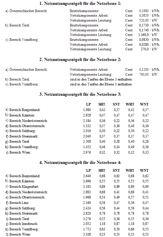 (1) Das von Entnehmern pro Zählpunkt zu entrichtende Netznutzungsentgelt wird wie folgt bestimmt. Die Entgelte für Entnehmer werden, sofern nicht besonders ausgewiesen, in Übereinstimmung mit § 52 Abs. 2 ElWOG 2010 in Cent/kW, in Cent/kWh bzw. in Form einer Jahresfixpauschale angegeben.