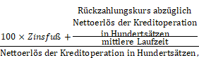 - d) die prozentuelle Gesamtbelastung bei Anleihen, Darlehen und sonstigen Krediten inländischer Währung unter Zugrundelegung der folgenden Formel nicht mehr als das Zweieinhalbfache des im Zeitpunkt der Kreditoperation geltenden Zinsfußes für Eskontierungen der Oesterreichischen Nationalbank (Anm.: Basiszinssatzes) (§ 48 Abs. 2 des Nationalbankgesetzes 1955, BGBl. Nr. 184, in der Fassung des Bundesgesetzes BGBl. Nr. 276/1969) beträgt;