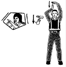 (Die abwärts gerichteten Arme zeigen mit den Handflächen zum Boden, dann wird eine Hand wiederholt aufwärts und abwärts bewegt, die andere Hand bleibt in Ruhestellung. Wird die linke Hand bewegt, ist das Triebwerk – beziehungsweise sind die Triebwerke – rechts zu drosseln; wird die rechte Hand bewegt, ist das Triebwerk – beziehungsweise sind die Triebwerke – links zu drosseln.)