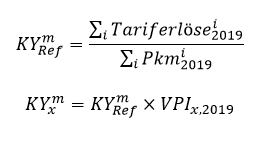 - b) Für kommerzielle Leistungen entspricht die Abgeltung des Verkehrsunternehmens dem bisher auf dem Markt erzielbaren Yield (inkl. Umsatzsteuer) für eine Grundfahrberechtigung ohne Zusatzleistung. Dieser kommerzielle Referenz-Yield (KYmRef) wird auf Basis der Tariferlöse und der Personenkilometer des Kalenderjahres (2019) aller kommerziell tätigen Verkehrsunternehmen gemäß § 2 dieser Verordnung ermittelt. Dabei werden auf Basis der kommerziellen Verkehrsleistungen je Verkehrsunternehmen (i) die gesamten kommerziellen Leistungen aller Verkehrsunternehmen im Basisjahr 2019 zur Berücksichtigung der Gesamtmarktsituation zusammengefasst. Der kommerzielle Abgeltungs-Yield KYmx für das abzurechnende Kalenderjahr (x) ergibt sich, darauf aufbauend, aus der Referenz-Yieldhöhe (inkl. Umsatzsteuer), die gemäß der Tarifinflation (VPI) jährlich fortgeschrieben wird.