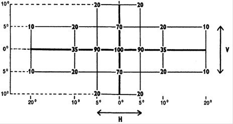 - 2.1. Die Richtung H = 0° und V = 0° entspricht der Bezugsachse (sie verläuft am Fahrzeug waagerecht und parallel zur Fahrzeuglängsmittelebene in Richtung der verlangten Sichtbarkeit). Sie geht durch den Bezugspunkt. Die in der Tabelle angegebenen Werte geben für die verschiedenen Meßrichtungen die Mindestwerte in Prozent des für jede Leuchte geforderten Mindestwerts in der Achse (Richtung H = 0° und V = 0°) an