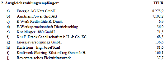 (6) Für den Netzbereich Oberösterreich werden folgende Ausgleichszahlungen festgelegt, wobei die Abwicklung der Zahlungen durch die Energie AG Netz GmbH zu erfolgen hat: