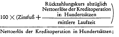 - d) die prozentuelle Gesamtbelastung bei Anleihen, Darlehen und sonstigen Krediten in inländischer Währung unter Zugrundelegung der folgenden Formel nicht mehr als das Zweieinhalbfache des im Zeitpunkt der Kreditoperation geltenden Zinsfußes für Eskontierungen der Oesterreichischen Nationalbank (§ 48 Abs. 2 des Nationalbankgesetzes 1955, BGBl. Nr. 184, in der Fassung des Bundesgesetzes BGBl. Nr. 276/1969) beträgt: