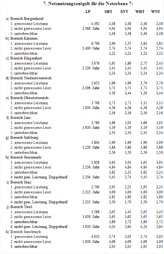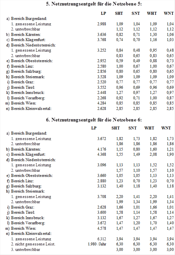 (1) Das von Entnehmern pro Zählpunkt zu entrichtende Netznutzungsentgelt wird wie folgt bestimmt. Die Entgelte für Entnehmer werden, sofern nicht besonders ausgewiesen, in Übereinstimmung mit § 52 Abs. 2 ElWOG 2010 in Cent/kW, in Cent/kWh bzw. in Form einer Jahresfixpauschale angegeben.