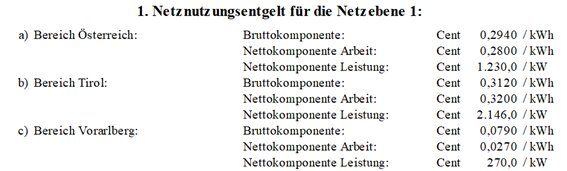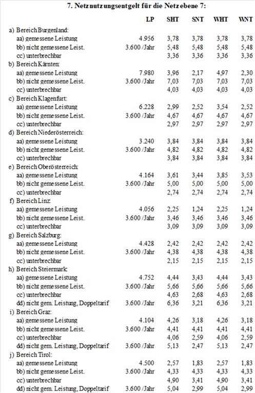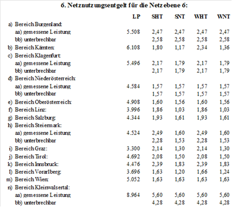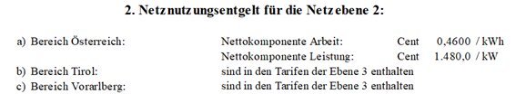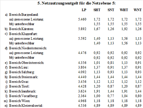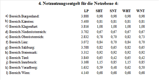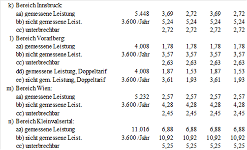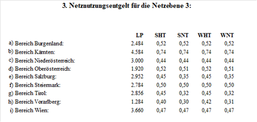 (2) Für die Netznutzung der Netzebene 3 der Austrian Power Grid AG sind folgende Jahresbeträge (in tausend Euro – TEUR) in zwölf gleichen Teilbeträgen monatlich zu leisten, wobei alle Rechnungen am 15. des dem Leistungserbringungsmonat folgenden Monats fällig sind: