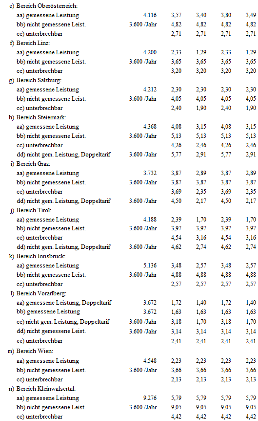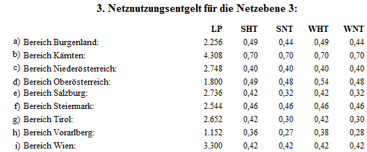 (2) Für die Netznutzung der Netzebene 3 der Austrian Power Grid AG sind folgende Jahresbeträge (in tausend Euro – TEUR) in zwölf gleichen Teilbeträgen monatlich zu leisten, wobei alle Rechnungen am 15. des dem Leistungserbringungsmonat folgenden Monats fällig sind: