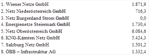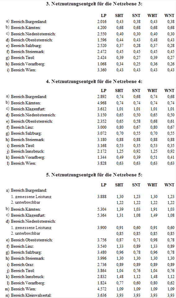 (2) Für die Netznutzung der Netzebene 3 der Austrian Power Grid AG sind folgende Jahresbeträge (in tausend Euro – TEUR) in zwölf gleichen Teilbeträgen monatlich an die Austrian Power Grid AG zu leisten.