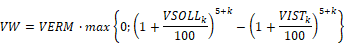 (2) Der Vergleichs-IST-Wert (VIST) und der Vergleichs-SOLL-Wert (VSOLL) berechnen sich analog zum IST-Wert (IST) und zum SOLL-Wert (SOLL), wobei sich der Durchrechnungszeitraum von 60 Monaten um jeweils zwölf Monate pro Folgejahr verlängert. Die Berechnung des Vergleichs-IST-Wertes ist auf Monatsbasis zu berechnen, wenn der IST-Wert auf Monatsbasis berechnet wird. Die Berechnung des Vergleichs-IST-Wertes ist auf Quartalsbasis zu berechnen, wenn der IST-Wert auf Quartalsbasis berechnet wird.