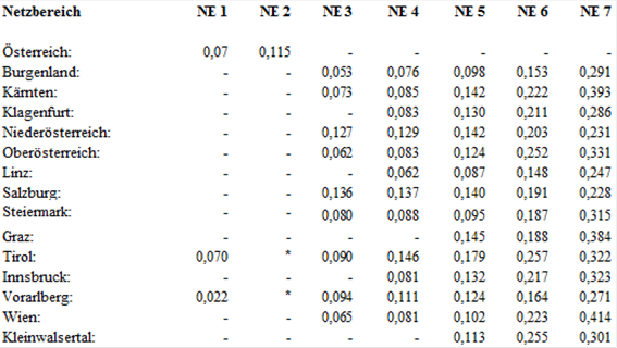 Für das von Entnehmern und Einspeisern pro Zählpunkt zu entrichtende Netzverlustentgelt werden jeweils folgende Entgelte je Netzebene (NE) in Cent/kWh bestimmt:
