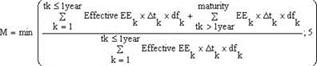 wobei dfk den risikofreien Abzinsungsfaktor für den künftigen Zeitraum tk, Δtk die Länge des Zeitintervalls tk-1 bis tk, EEk den durchschnittlichen Marktwert gemäß § 243 Abs. 3 Z 2 und EffectiveEEk den maximalen durchschnittlichen Marktwert gemäß § 243 Abs. 3 Z 3 bezeichnet; Kreditinstitute, die zur Berechnung einer einseitigen Anpassung der Kreditbewertung ein internes Modell verwenden, können als M die anhand eines solchen Modells geschätzte effektive Kreditlaufzeit einsetzen; findet Abs. 4 Anwendung, gilt für alle Netting-Sätze, in denen alle Verträge eine Ursprungslaufzeit von höchstens einem Jahr haben, die Formel gemäß Z 1; berechnet ein Kreditinstitut den gewichteten Forderungsbetrag gemäß § 70 Abs. 1 Z 5 ist M die effektive Kreditlaufzeit, zumindest aber ein Jahr und