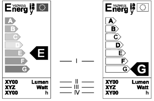 Das Etikett muß einen mindestens 2 mm breiten Rand haben (wie abgebildet). Wenn keine Seite der Verpackung genügend Platz für das Etikett und diesen Rand bietet oder dadurch mehr als 50% der Oberfläche der größten Seite eingenommen würde, dürfen das Etikett und der Rand so weit verkleinert werden, bis diese beiden Bedingungen erfüllt sind. Das Etikett darf jedoch in keinem Fall auf weniger als 40% seiner Originallänge und ‑breite verkleinert werden. Ist die Verpackung für ein solches verkleinertes Etikett zu klein, so muß das Etikett der Lampe oder der Verpackung beigefügt werden. Wo ein Etikett von voller Größe zusammen mit der Lampe ausgestellt ist (zB an dem Regal, auf dem die Lampe ausgestellt ist), darf das Etikett auf der Verpackung entfallen.