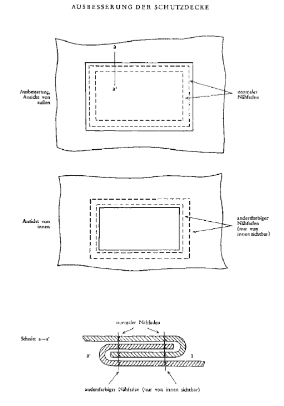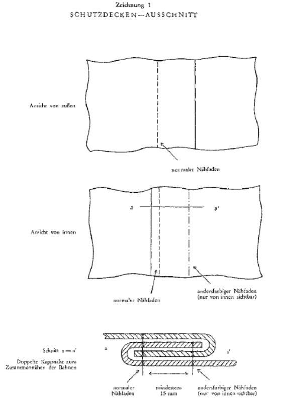 - 5. Ausbesserungen sind nach dem in der Zeichnung 4 beschriebenen Verfahren vorzunehmen; die Ränder müssen ineinandergefaltet und durch zwei sichtbare, mindestens 15 mm voneinander entfernte Nähte miteinander verbunden sein. Die Farbe des auf der Innenseite sichtbaren Fadens muß sich von der Farbe des auf der Außenseite sichtbaren Fadens und von der Farbe der Schutzdecke unterscheiden; alle Nähte müssen mit der Maschine genäht sein. Ausbesserungen von Schutzdecken aus kunststoffbeschichtetem Gewebe können auch nach dem in Absatz 4 beschriebenen Verfahren vorgenommen werden.