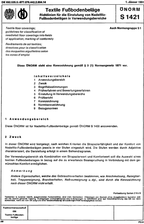 Textile Bodenbeläge, die nach dieser ÖNORM eingestuft werden müssen Angaben über den Strapazierwert und den Komfortwert aufweisen. Die Darstellung erfolgt in Form eines Balkendiagrammes (Bild 1).