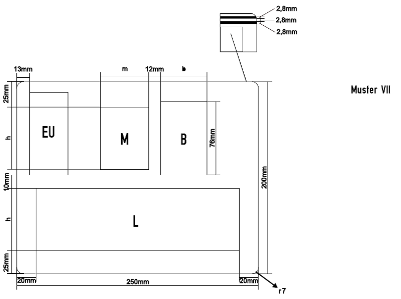 B | I ,III, VII, VIII | Bundeswappen oder Wappen des Bundeslandes mit unterhalb ausgeschriebenem Namen des Bundeslandes (Blockbuchstaben, Höhe: 4 mm oder 5 mm je nach Wortlänge) thermoplastisch aufgebracht. | |