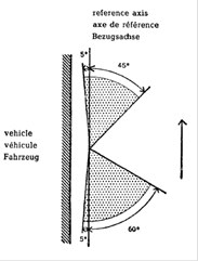 In allen Fällen betragen die lotrechten Mindestwinkel der räumlichen Lichtverteilung der Fahrtrichtungsanzeiger ausgehend von der Waagerechten 15° nach oben und 15° nach unten.